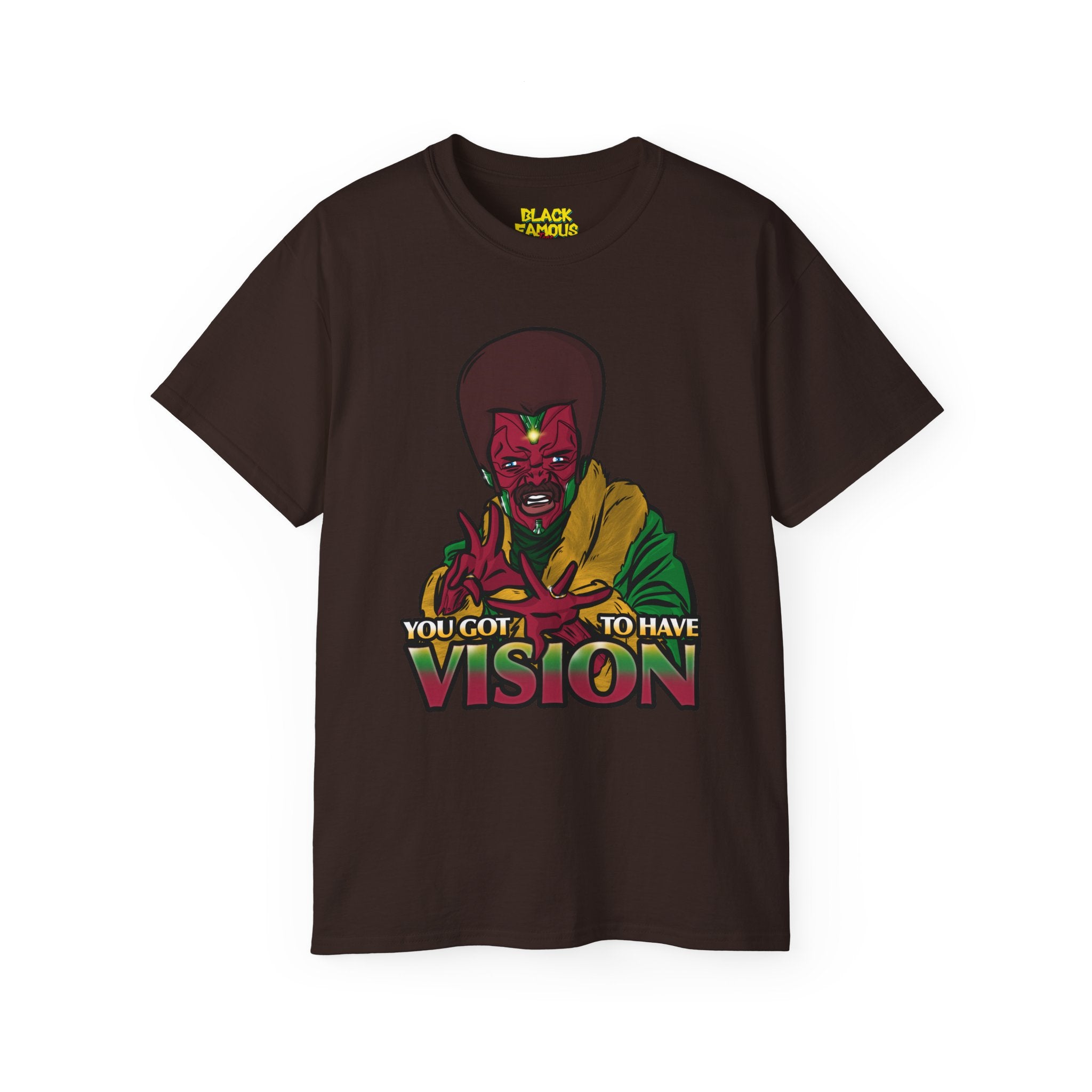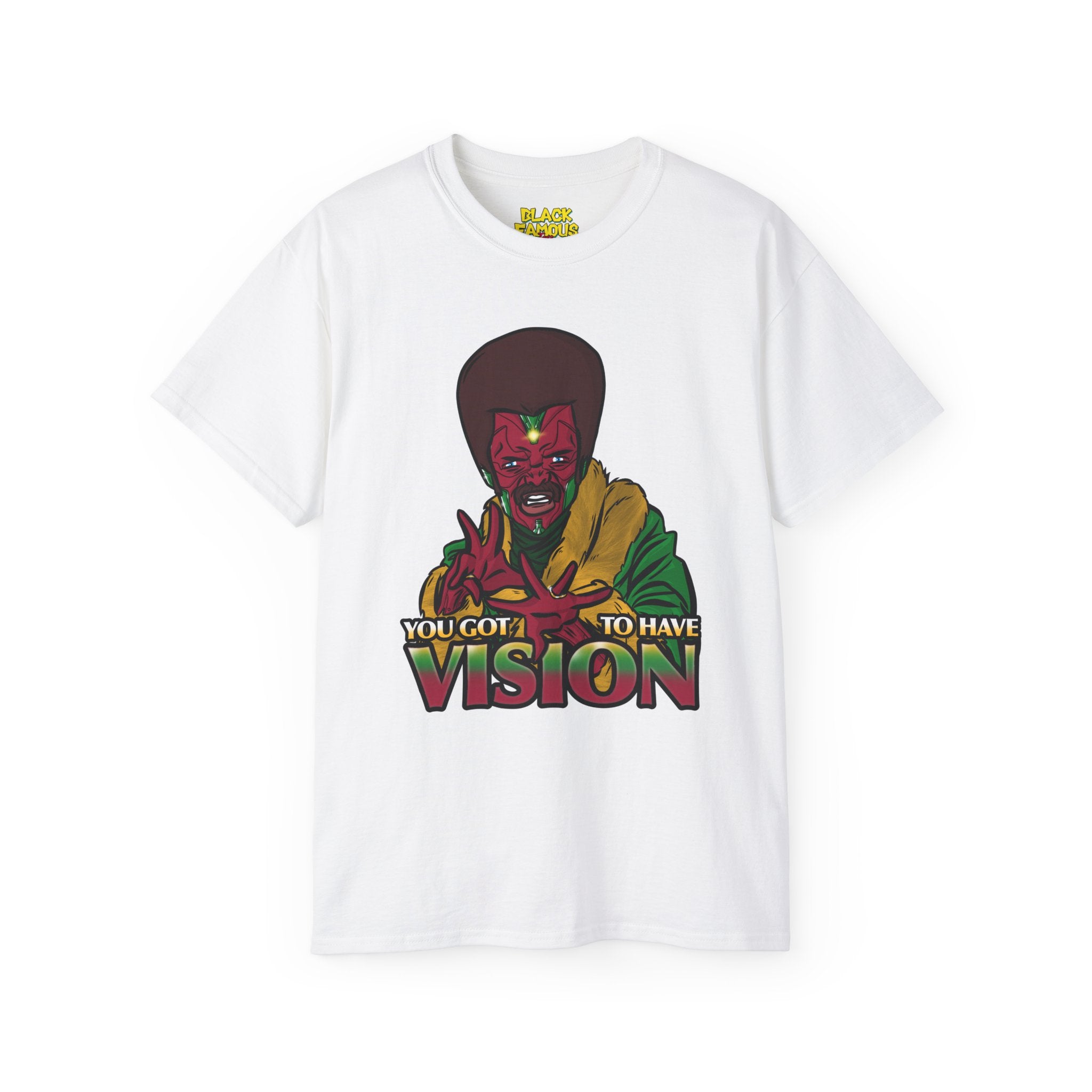 This heavyweight cotton tee carries a bold, retro-feel illustration front-and-center: a stylized, soulful character with vintage afro and layered colors that read like a comic-book poster. The artwork’s warm, earthy palette and punchy text (“You got to have VISION”) give the shirt a confident, expressive vibe — equal parts streetwear and nostalgic pop art. Wear it when you want your message to lead the conversation: paired with worn denim, a bomber jacket, or layered under an open flannel, it becomes a statement piece that feels lived-in and intentional. The thicker, vintage-feel fabric and roomy cut make it comfortable for long days of city wandering, creative sessions, or casual meetups with friends who appreciate art-forward threads.